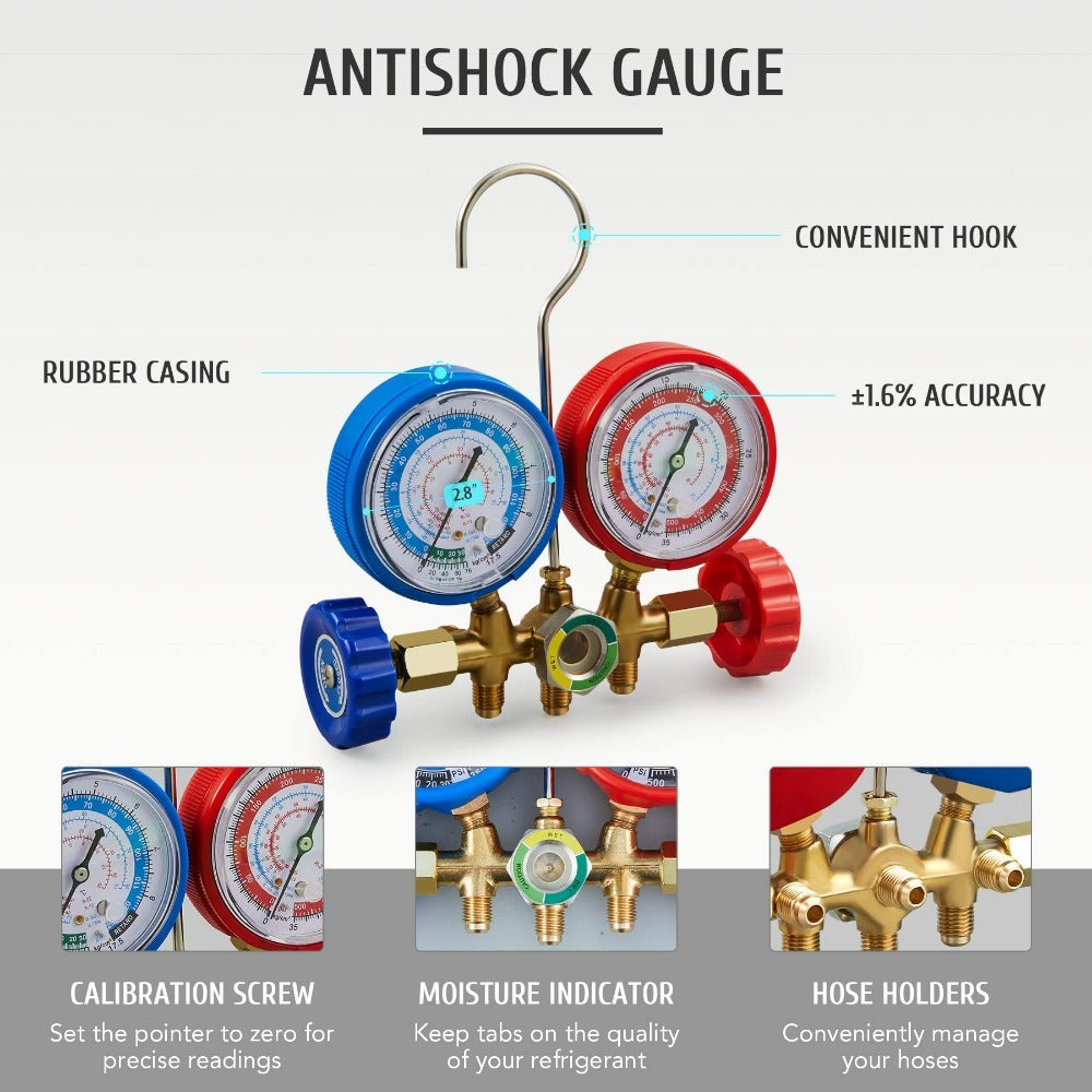 • WIDE APPLICATION: This car AC gauge set works with R134a, R12, R22, and R502 refrigerants; ideal for both DIY and professional HVAC maintenance, it allows you to measure your system's pressure, evacuate and refill coolant, and more